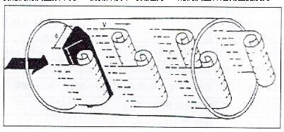 在蒸汽流體中設置三角柱型旋渦發生體,則從旋渦發生體兩側交替地產生有規則的旋渦,這種旋渦稱為卡門旋渦,如右圖所示,旋渦列在旋渦發生體下游非對稱地排列。