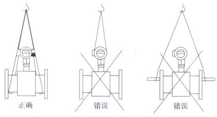電磁流量計在搬運和吊裝傳感器時,應該將吊索套在傳感器兩端頸部位置或吊環上,切勿在測量管內套入管棒進行吊裝,以免損壞襯里(見圖)。在吊裝和搬運電磁流量計過程中,必須防止傳感器襯里和接線盒受碰撞而損壞。