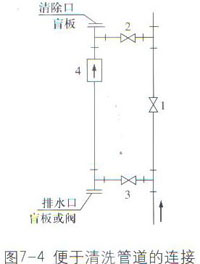 智能電磁流量計不管是水平安裝或者是垂直安裝,在連續(xù)生產(chǎn)的工藝管道上,為了不影響生產(chǎn),便于儀表維修拆裝,傳感器盡可能采用與原先主工藝管道并聯(lián)安裝(旁路管)的方式,特別對有嚴重污染要經(jīng)常清洗的液體。圖7-4所示是傳感器不卸下,在線清洗安裝實例。