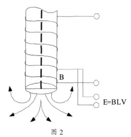 與一般污水流量計(jì)不同的是, 插入式污水流量計(jì)的傳感器是外側(cè)形成外發(fā)射磁場, 測量電極在傳感器的端部或兩側(cè)如圖 2 所示,值得注意的是,外發(fā)射磁場電磁流速傳感器的感應(yīng)信號受流體和磁場的邊界層厚度影響, 會降低測量的線性度。