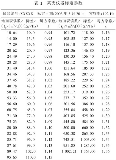 電磁流量計是一種直接測量流體流量的儀器,因此所測流量可直接讀取。而用渦輪流量計求取流量時,首先需要經(jīng)過大量的線性回歸和公式計算,計算煩瑣且精度不高,給資料的解釋工作帶來較大難度。電磁流量計一般要經(jīng)過標定才能在現(xiàn)場應用,某支儀器的標定參數(shù)見表1。
