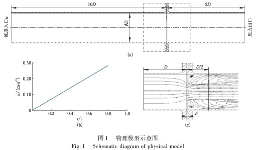 圖1為孔板流量計的物理模型示意.根據(jù)標(biāo)準(zhǔn)孔板流量計的安裝,圖1a中,上下游直管段長分別取10D和5D作為穩(wěn)定直管段.其中上下游管內(nèi)徑D取100mm,孔板厚度δ取3mm.