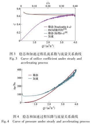 對于流量Q≤0.6m3/h,C0隨流量的增加緩慢下降,之后保持在0.63左右.與C0不同的是,C從0開始隨流量的增大而增大,并逐漸向C0靠近,直至Q≥3.5m3/h后才達(dá)到C0的水平.C在時間上滯后于C0.圖4中△p-Q曲線顯示,Q≤3.0m3/h時,加速過程孔板前后壓降高于同等流量下穩(wěn)態(tài)壓降;Q≥3.0m3/h后,瞬態(tài)壓降才降為穩(wěn)態(tài)水平.