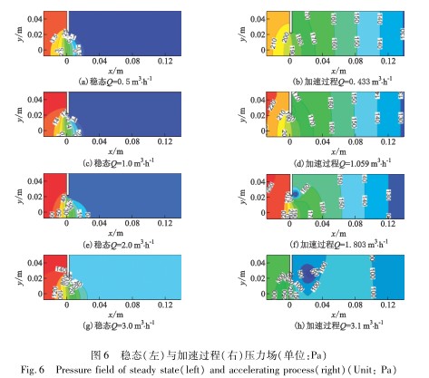 從內(nèi)流角度分析導(dǎo)致第2.1節(jié)中C和C0不同的原因,圖5和圖6分別給出并對比了相同流量下穩(wěn)態(tài)和加速過程中流經(jīng)孔板前后流體的速度和壓力場.對于Q≤3.0m3/h穩(wěn)態(tài)條件,孔板后方始終可觀察到一個被拉長的主渦和孔板右上方的小渦,流動的損失較大,同時表明流場中已形成穩(wěn)定的流動通道,動能和壓能的轉(zhuǎn)化已達(dá)到平衡,流動的損失(長漩渦)也趨于穩(wěn)定,并且壓差隨流量的增大而穩(wěn)定增大.