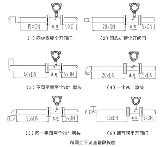 渦輪流量計(jì)對(duì)管道內(nèi)流速分布畸變及旋轉(zhuǎn)流是敏感的,進(jìn)入傳感器應(yīng)為充分發(fā)展湍流,因此要根據(jù)傳感器上游側(cè)阻流件類(lèi)型配備必要的直管段或整流器,要求入口段和出口段直管段長(zhǎng)度。