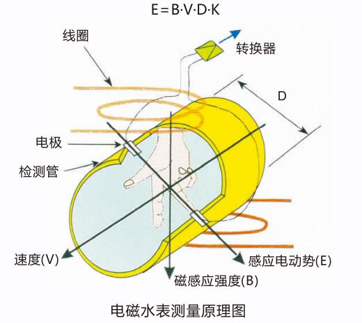 根據(jù)法拉第電磁感應原理,在與測量管軸線和磁力線相垂直的管壁上安裝了對檢測電極,當導電液體沿測量管軸線運動時,導電液體切割磁力線產(chǎn)生感應電勢,此感應電勢由兩個檢測電極檢出,數(shù)值大小與流量成正比例,其值為: