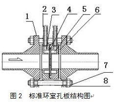 - 法蘭;2、導壓管;3、前環室;4、節流件;5、后環室;6、密封墊片;7、螺栓;8、螺母