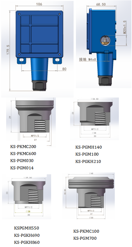KS-PKM系列:丁腈橡膠(Buna-N)膜片及0型圈,1/2”NPTF壓力接口鋁合金材質(zhì)